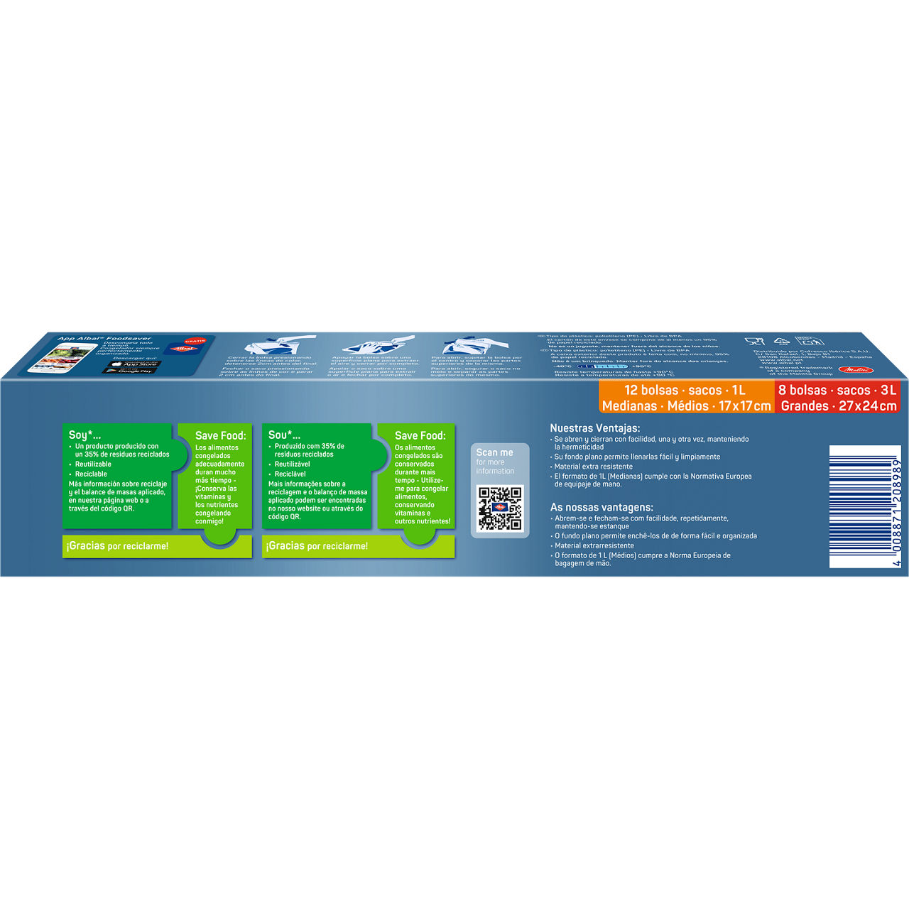A reciclagem também desempenha um papel fundamental: as sacolas de freezer da® Albal são feitas de 35% de materiais reciclados, e pretendemos continuar aumentando essa porcentagem no futuro para melhorar ainda mais sua sustentabilidade. Materiais reciclados incluem, por exemplo, resíduos orgânicos do ciclo dos alimentos, que são completamente seguros para contato com alimentos.